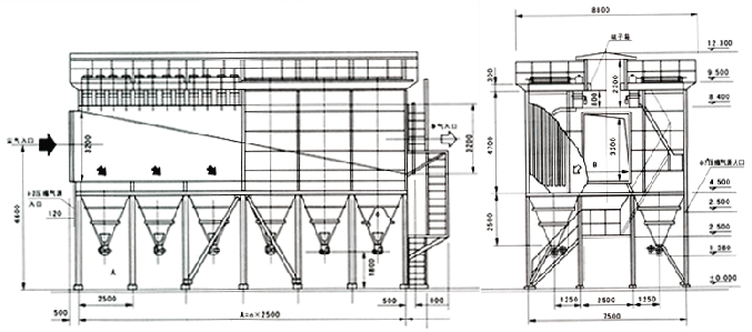 該除塵器采用逐行噴吹的方式,可通過噴吹管上開孔孔徑的變化,合理調(diào)節(jié)壓縮空氣噴吹到袋底的壓力,使其既能清灰徹底,又不損傷除塵布袋。