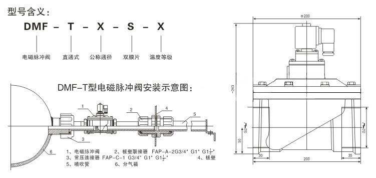 DMF-T型電磁脈沖閥為直通閥,其進(jìn)氣口之間夾角為180°(進(jìn)出口中心線為同一直線),其進(jìn)口與儲(chǔ)氣筒連接,出口與噴吹管連接。氣流暢通,能提供符合要求的清灰氣脈沖。