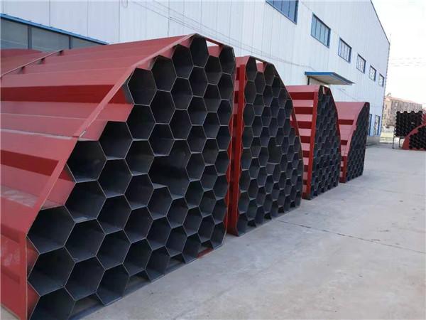 ?。?)蜂窩式電捕焦油器。蜂窩式與管式的結構相同,是將通道截面由圓形改為正六邊形。兩個相鄰正六邊形共用一條邊,即靠中間的正六邊形的六條邊均被包圍它的六個正六邊形所共用。用2~3mm的鋼板制成的蜂窩板即可滿足工藝和機械強度的要求。由于蜂窩式電捕焦油器具有結構緊湊合理、沒有電場空穴、有效空間利用率高、重量輕、耗鋼材少和捕集特性好等優(yōu)點,但存在制造難度大,在運輸安裝過程中易產生誤差等缺點。隨著設備制造工藝水平的提高,蜂窩式電捕焦油器的優(yōu)點會越來越受到人們的重視,必將逐步取代同心圓式和管式電捕焦油器。鈺泰環(huán)保生產蜂窩式電捕焦油器