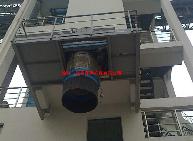 伸縮溜管采用雙層套管結(jié)構(gòu),由溜筒和防塵罩構(gòu)成。溜筒內(nèi)通過物料,防塵罩外套在溜筒上,期間行程吸塵腔。無塵伸縮溜管底部將設(shè)料位傳感器和防塵群罩。料位傳感器將設(shè)在外側(cè)或內(nèi)側(cè),防塵群罩將采用分塊重疊式。在裝車過程中料位傳感器接觸物料后,無塵伸縮溜管將及時提升使料頂與堆積的物料始終保持一定距離。防塵罩能罩在料堆上,以保證吸塵效果,防止粉塵外溢。溜筒將采用附有聚氨酯耐磨襯板的鋼板制成,防塵罩采用防靜電柔軟強(qiáng)度大的化纖材料制成。防塵罩內(nèi)將設(shè)置支承骨架,既可上下伸縮,又可保證氣流通暢。伸縮溜管升降自如,無阻滯現(xiàn)象;在伸縮溜管底部將至少設(shè)3個吊點(diǎn),以保證升降機(jī)構(gòu)帶動伸縮溜管平穩(wěn)升降。伸縮溜管外形尺寸圖/外伸縮防塵罩圖片