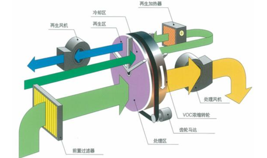 通過轉(zhuǎn)輪的旋轉(zhuǎn),可在轉(zhuǎn)輪上同時完成氣體的濃縮和沸石的再生。進(jìn)入濃縮轉(zhuǎn)輪的有機(jī)廢氣在常溫下被轉(zhuǎn)輪吸附區(qū)吸附凈化后直接排放至大氣,接著因轉(zhuǎn)輪的轉(zhuǎn)動而進(jìn)入脫附區(qū),吸附了有機(jī)物質(zhì)的沸石在此區(qū)內(nèi)脫附,吸附在沸石上的有機(jī)物被分離、脫附、進(jìn)入后續(xù)處理系統(tǒng),如此循環(huán)工作。