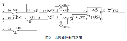 (2)回路元器件損壞。如圖2所示,按下sB4按鈕,限位正常,關(guān)排污閥無反應(yīng),需要查看熱偶FR2是否動作,或查看接觸器KM3是否缺相及節(jié)點損壞。熱偶動作需要復(fù)位,并檢查閥桿是否卡澀及超過行程,結(jié)合實際問題進(jìn)行處理。