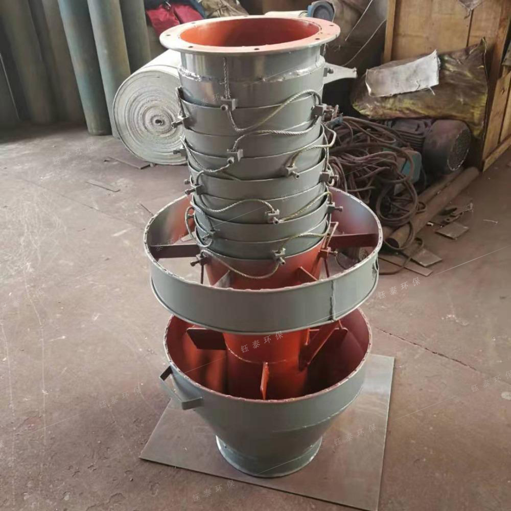 制作外伸縮布袋方式:要求伸縮布袋上每2個相鄰漲圈之間的垂直間距必須≤10cm,見圖1。當(dāng)外伸縮布袋折疊后2個相鄰漲圈之間的布袋向內(nèi)褶皺時,不能阻擋住與內(nèi)直鋼套筒外壁之間形成的環(huán)形負(fù)壓吸塵通道的橫截面,從而降低負(fù)壓吸塵的通過量??蛻羰褂矛F(xiàn)場反饋漲圈間距大的吸塵氣流明顯比漲圈間距小的吸塵氣流更加順暢。