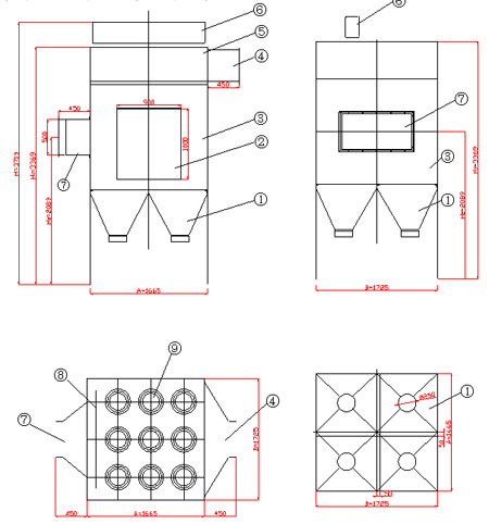 3、設(shè)備外形尺寸見(jiàn)附圖及尺寸表。我公司還可根據(jù)用戶(hù)現(xiàn)場(chǎng)場(chǎng)地情況設(shè)計(jì)符合用戶(hù)要求外形的除塵器。