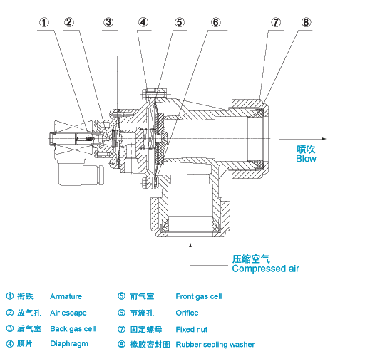 脈沖噴吹控制儀的電信號(hào)使電磁脈沖閥銜鐵后移,閥后氣室放氣孔打開(kāi),后氣室迅速失壓,膜片組件后移,壓縮空氣通過(guò)閥輸出口噴吹,電磁脈沖閥處于“開(kāi)啟”狀態(tài)。