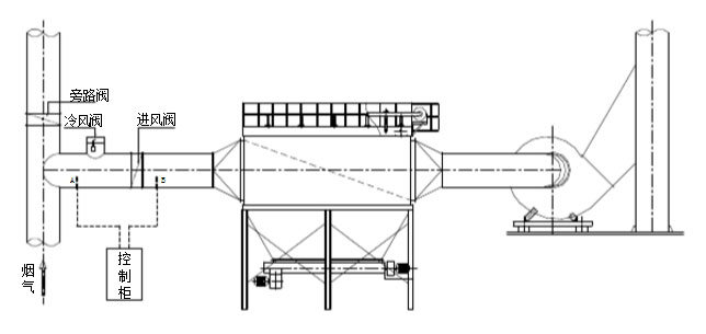 煙氣溫度一旦高于除塵器正常使用溫度,自動控溫裝置啟動冷風(fēng)閥,放進(jìn)冷風(fēng),同時電鈴自動報警,提示操作工采取降溫措施;當(dāng)煙氣溫度降至正常使用溫度時,冷風(fēng)閥自動關(guān)閉,操作也恢復(fù)正常;當(dāng)采取放冷風(fēng)后,煙氣溫度仍超過除塵器的允許O高溫度時,進(jìn)風(fēng)閥會自動關(guān)閉,旁路閥打開,煙氣進(jìn)入旁路煙道排空,確保除塵器的安全運(yùn)行。