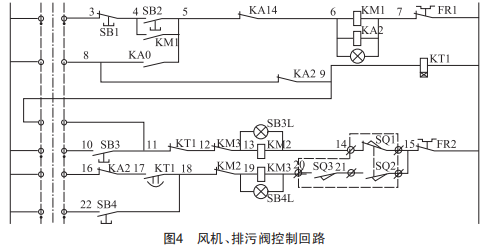 風(fēng)機(jī)、排污閥控制回路如圖4所示,圖中3~22為接線端子編號,KA14為基本水位繼電器常閉節(jié)點,除塵器長時間處于停運(yùn)狀態(tài)并且排污閥存在漏水現(xiàn)象,水箱內(nèi)部大部分水流失。遠(yuǎn)程啟動風(fēng)機(jī)時,負(fù)壓對水箱水位造成波動,使基本水位信號消失,KA14斷開,風(fēng)機(jī)停運(yùn)聯(lián)鎖排污閥打開,同時進(jìn)水電磁閥動作,KT1計時時間到后排污閥關(guān)閉。關(guān)閉到位,進(jìn)水電磁閥保持進(jìn)水,基本水位信號亮起,KA14閉合,風(fēng)機(jī)啟動,造成基本水位信號消失。之后不斷循環(huán)以上步驟,浪費(fèi)大量水源及影響設(shè)備正常運(yùn)行,需要及時對排污閥漏水問題進(jìn)行處理。
