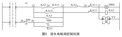 進(jìn)水電磁閥控制回路如圖3所示,圖中23~29為接線端子編號,除塵器上水流程是電磁閥YV打開,水位到達(dá)備用水位時,觸發(fā)KA11動作,KA11的常閉節(jié)點斷開,電磁閥失電,停止注水。導(dǎo)致水箱漫水的原因主要有以下幾種: